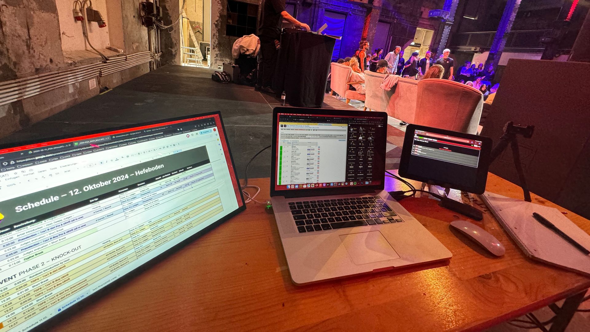 movetoohot war mit einem kleinen Team vertreten und sorgte für das komplette «Rundown & Screen Management». Mit den Tools von and8.dance wurde die Registrierung und das Check-In einfach und problemlos abgewickelt. Über den Screen (Beamer auf Leinwand) wurden alle für Publikum und Tänzer:innen wichtige Informationen sichtbar gemacht. Die Jury bewertete mit dem and8 Judging System auf Tablets die einzelnen Battles im «Round-per-Round» Modus und mit der «Threefold-Matrix» (3 Fader). Zusätzlich lieferte unser Team auch die komplette Zeit- und Rundownplanung und kümmerte sich um das Briefing von Deejay, Host und Judges.